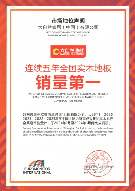 歐睿咨詢作為世界先進的權威市場調查機構,所出示的調研數據具有行業認可的公信力。據歐睿咨詢發布的數據顯示,大自然家居的實木地板在過去五年中一直保持著國內市場的領先地位,穩坐“全國實木地板銷量第一”寶座,展現出了強大的市場競爭力和品牌影響力。
